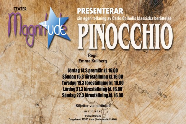 Följ med på en lekfull, varm och tänkvärd tolkning av Pinocchio, där fantasi, humor och allvar möts på scenen. Här möter publiken välkända och oväntade gestalter, syrsan som vägleder, läkare som försöker förstå, färgstarka cirkusartister, och kanske är det snigeln som berättar hela historien - kom och se, njut och upplev!