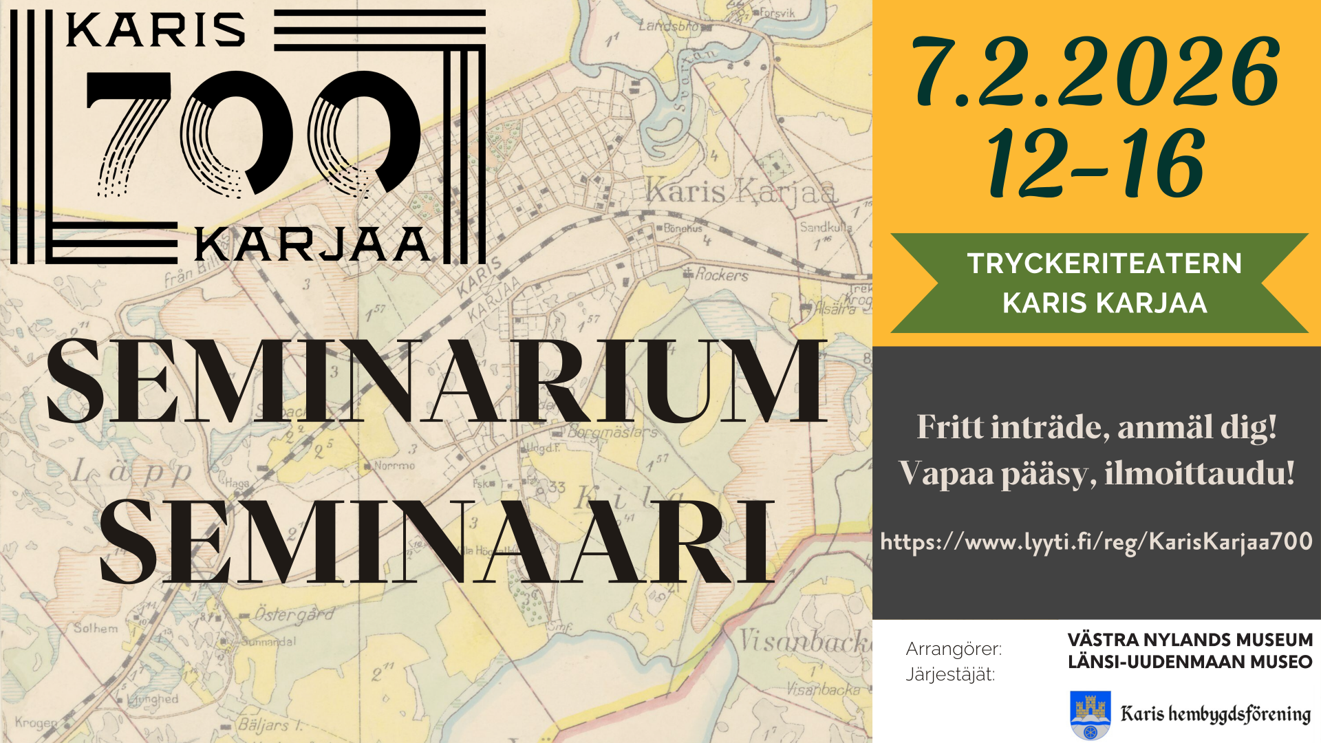 Alueellinen vastuumuseo Länsi-Uudenmaan museo järjestää lauantaina 7. päivä helmikuuta 2026 yhteistyössä Karjaan kotiseutuyhdistyksen kanssa Karjaa700-seminaarin. Seminaari on kaksikielinen, maksuton ja avoin kaikille aiheesta kiinnostuneille, ja siinä esitellään viime vuosien Karjaata koskevia tutkimuksia. Seminaarissa neljä eri tutkijaa esittelee työnsä tuloksia, jotka ulottuvat muinaislinnoista keskiajan ja kansanuskon taruolentojen kautta vuoden 1918 tapahtumiin.